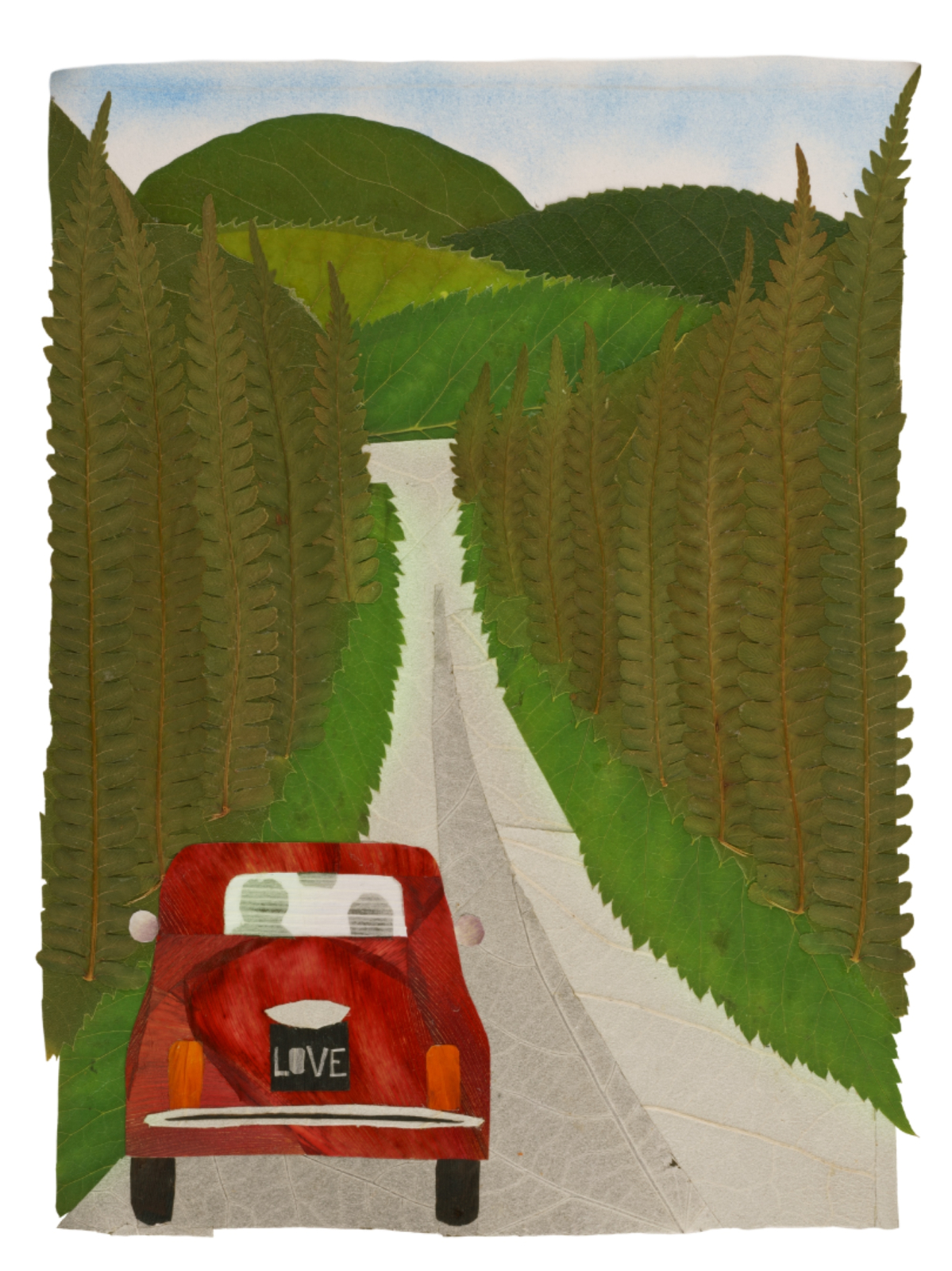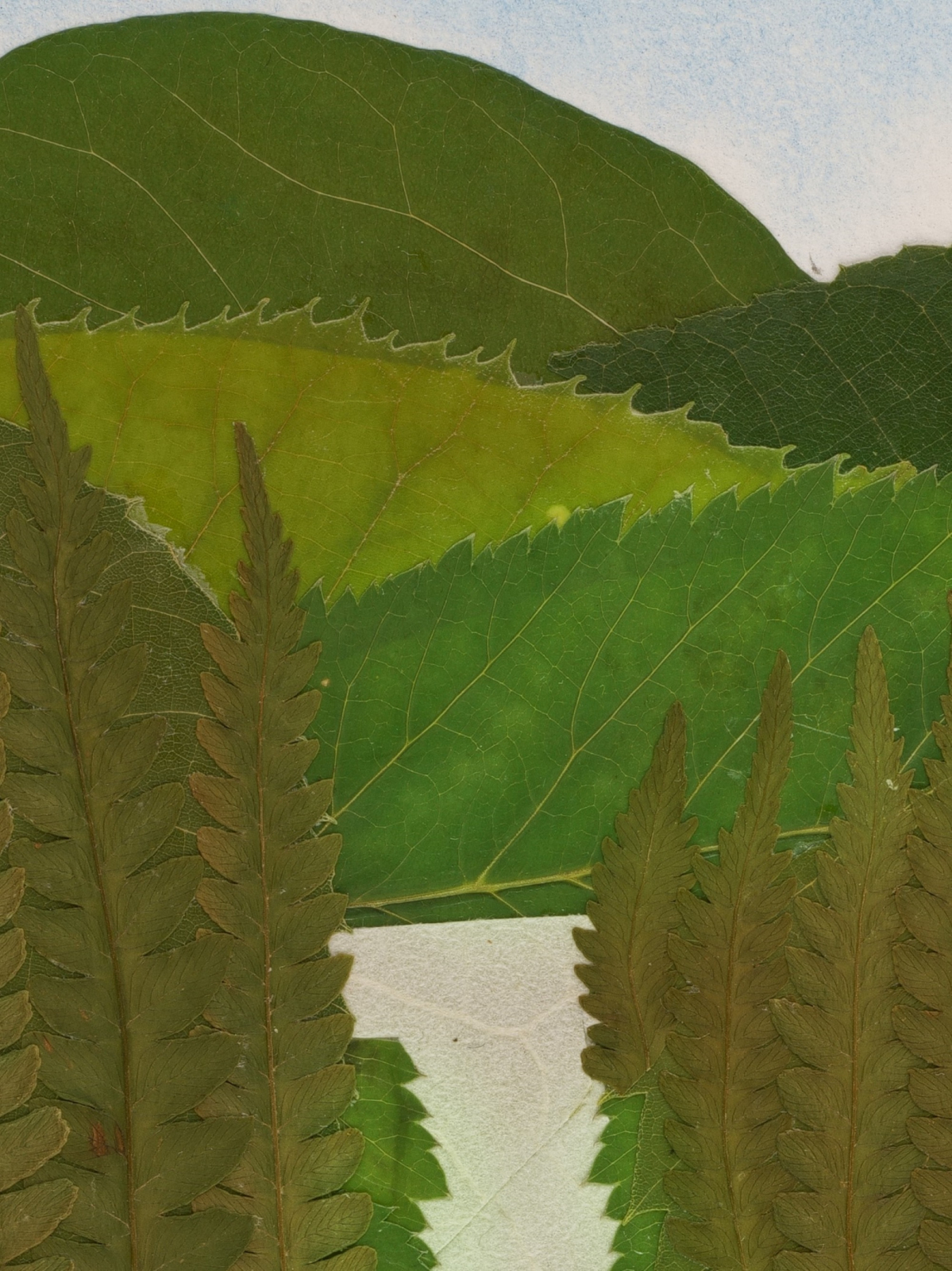 Aceasta piesa artistica prezinta feriga, frunze de plop argintiu, petale de lalea, banana si praz, toate culese si presate manual, pentru a le pastra frumusetea naturala.