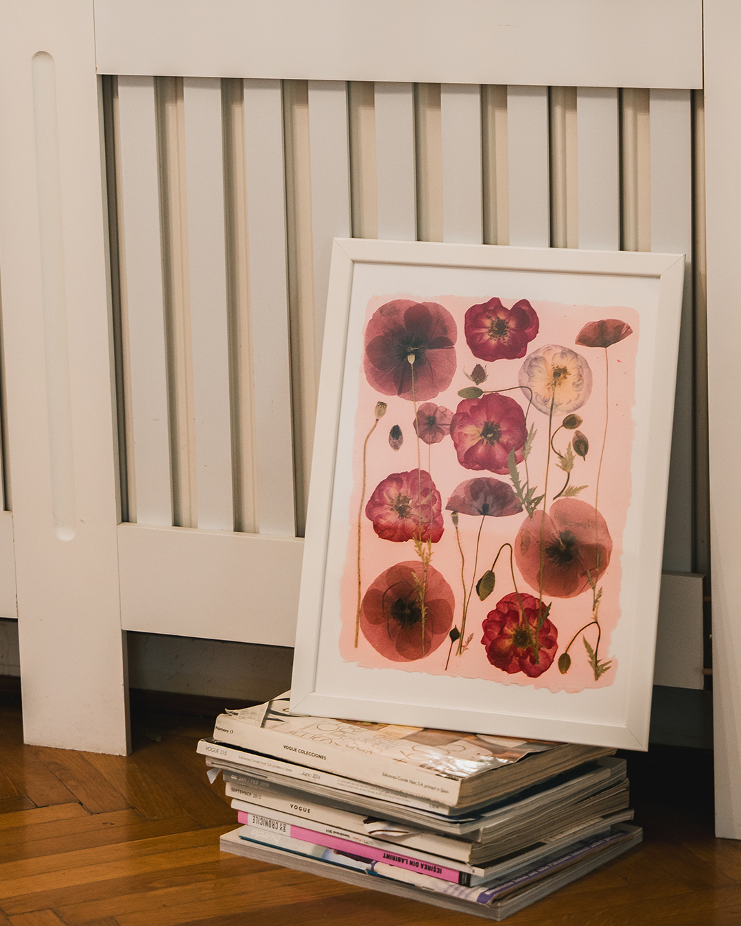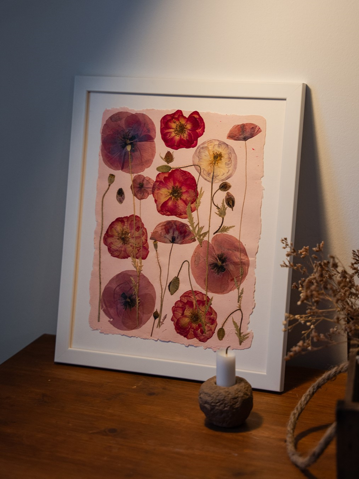 Flori si Emotii Aceasta piesa artistica prezinta maci rosii si roz, alaturi de trandafiri, toate culese si presate manual, pentru a pastra frumusetea naturala a fiecarei flori. Art printul nu este o simpla imagine, ci o invitatie la contemplare si apreciere a frumusetii care ne inconjoara.